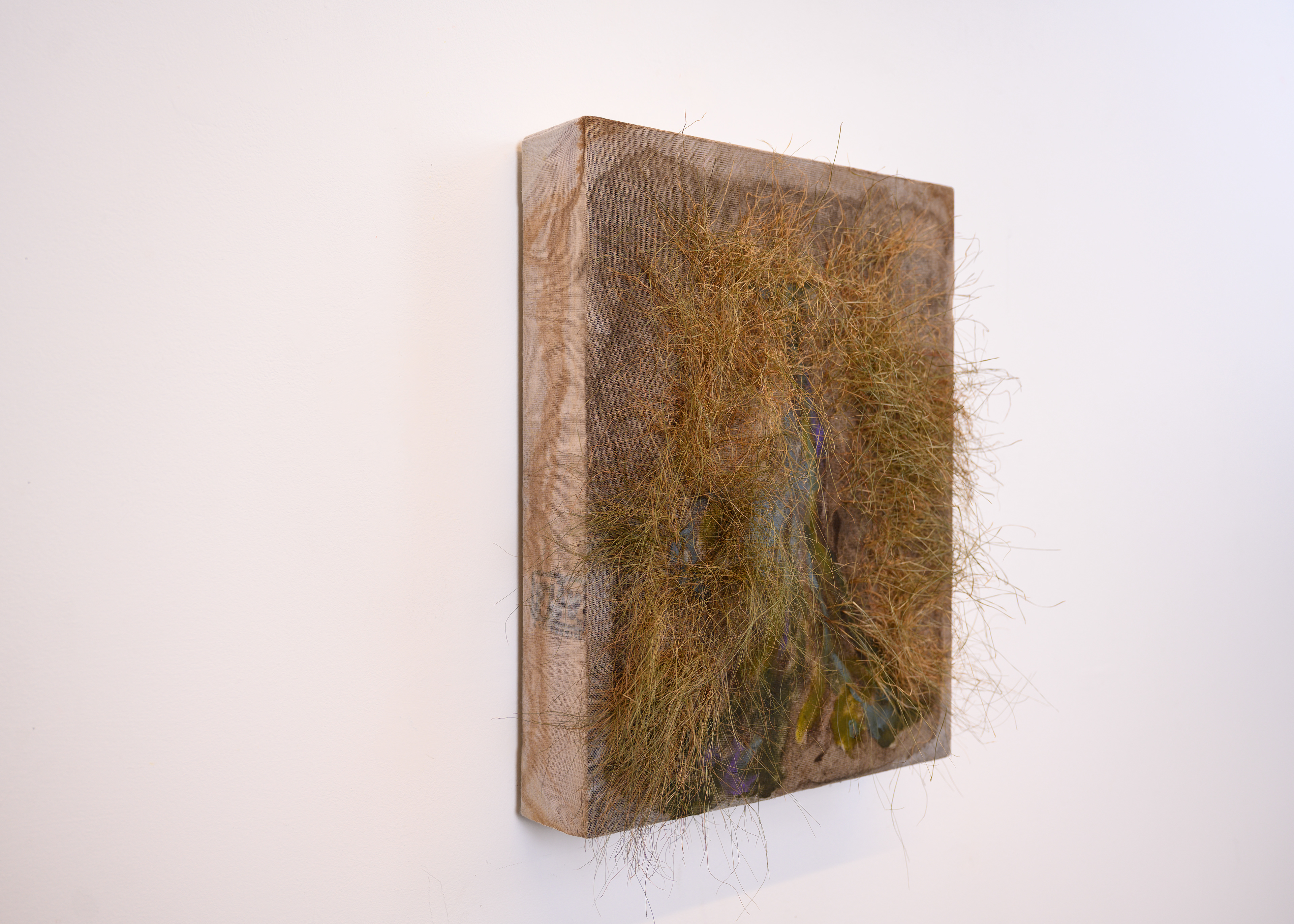 2025, oil on canvas, soil, Kentucky bluegrass seed, Flāv Corp 2x4s.