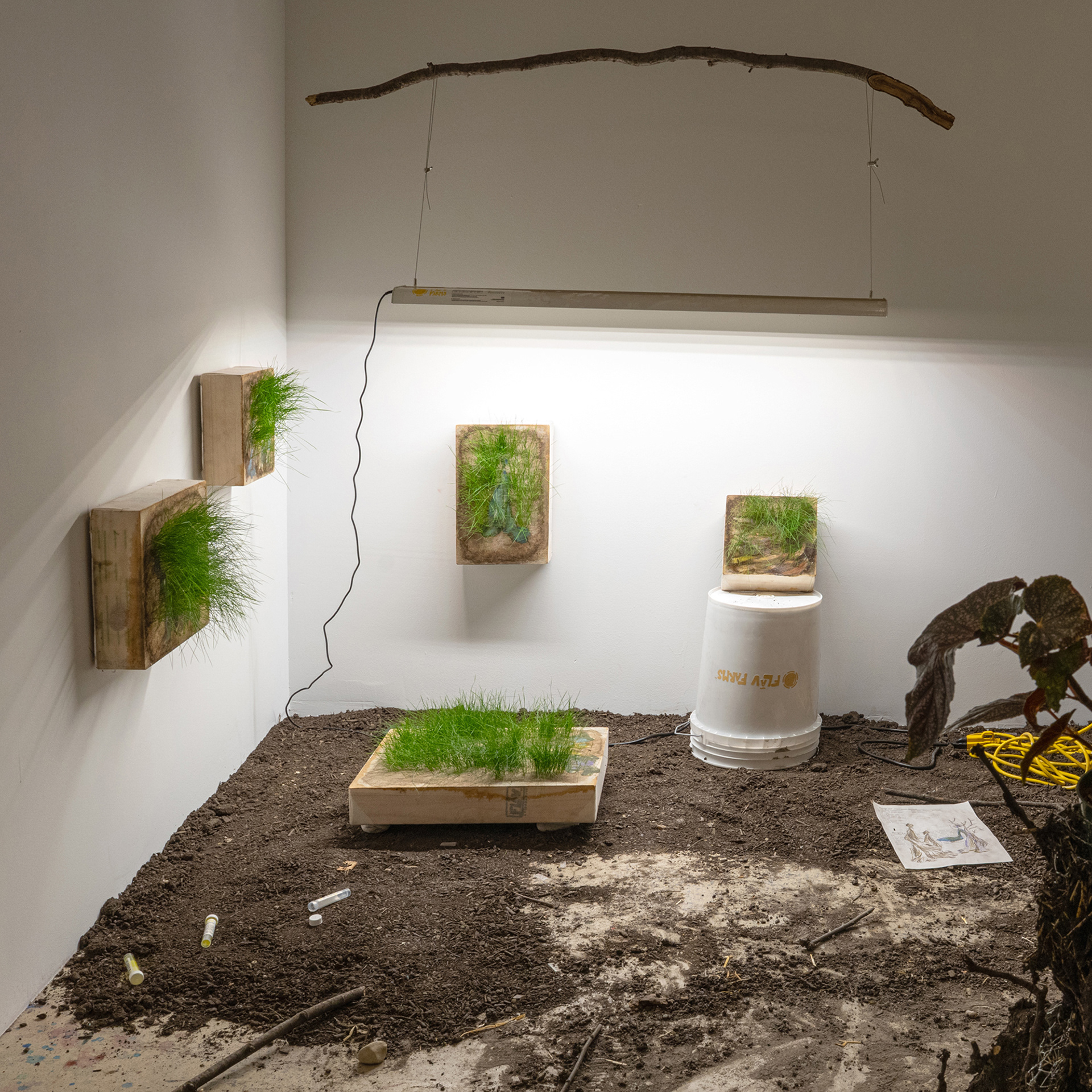 2025, oil on canvas, soil, Kentucky bluegrass seed, Flāv Corp 2x4s, Flāv Farms grow light.