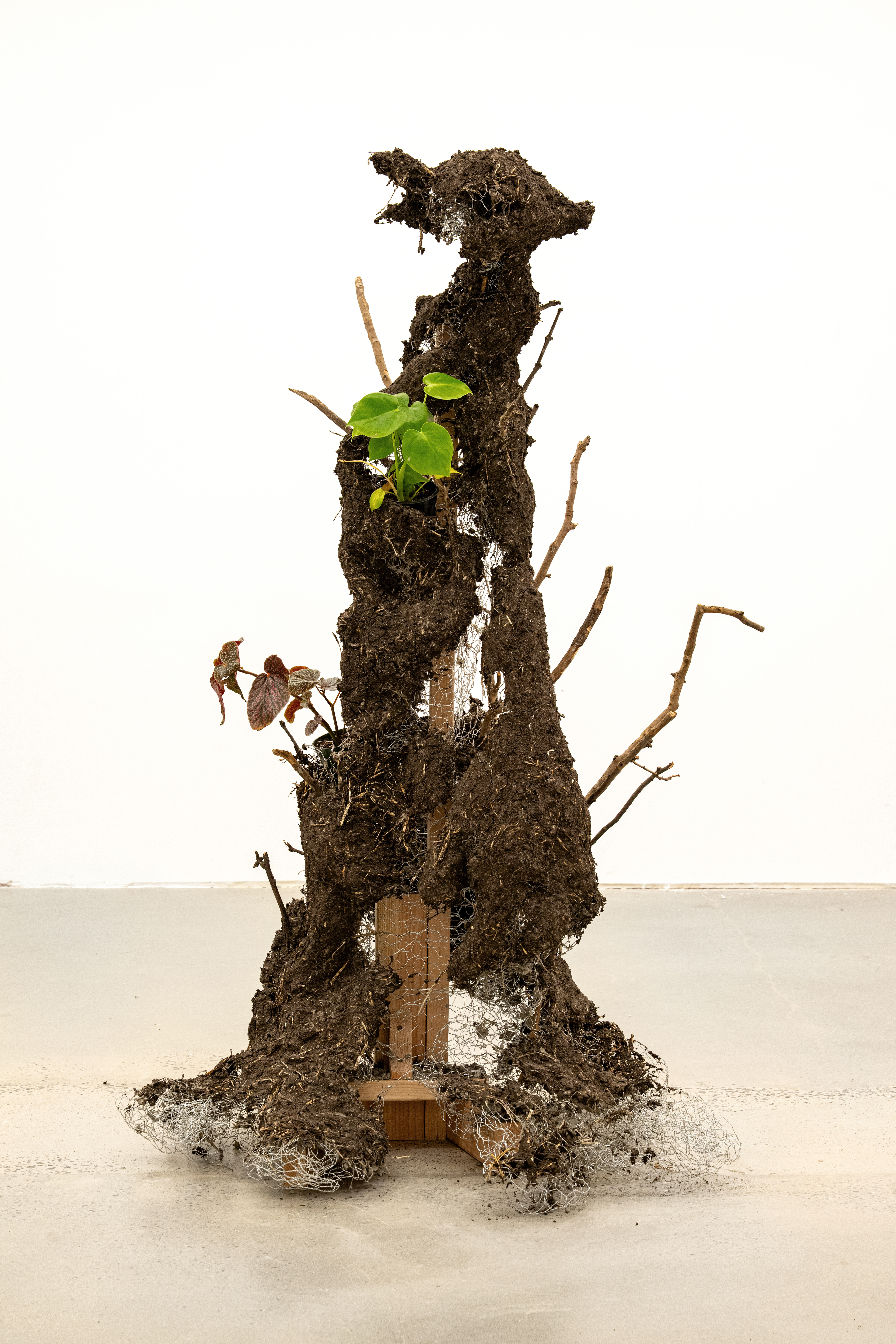 2025, dirt, clay, sand, straw, binder, wood, chicken wire, sticks, potted plants.